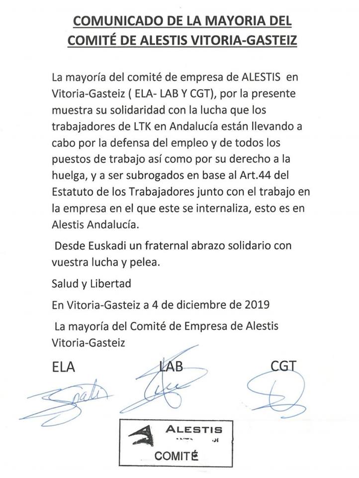 La sección sindical de LAB del centro de trabajo de Alestis en Gasteiz muestra su apoyo y solidaridad a los trabajadores y trabajadoras de la subcontrata LTK de Alestis en Andalucía y al sindicato andaluz SAT, quiénes están llevando adelante una lucha ejemplar en defensa del empleo, en contra de los 34 despidos realizados, por el derecho a la huelga y por el derecho que tienen a ser subrogados e integrados en Alestis en base al articulo 44 del Estatuto de los Trabajadores.
