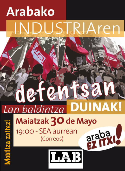 LAB sindikatuak deituta, bihar maiatzak 30, Arabako industriaren defentsan eta enplegu duinaren aldeko mobilizazioa eguna izango da Gasteizen. Goizean Jaurlaritzan bukatuko den kotxekaraba batek hiria zeharkatuko du eta arratsaldez mobilizaioa burutuko da SEA patronalaren aurrean.