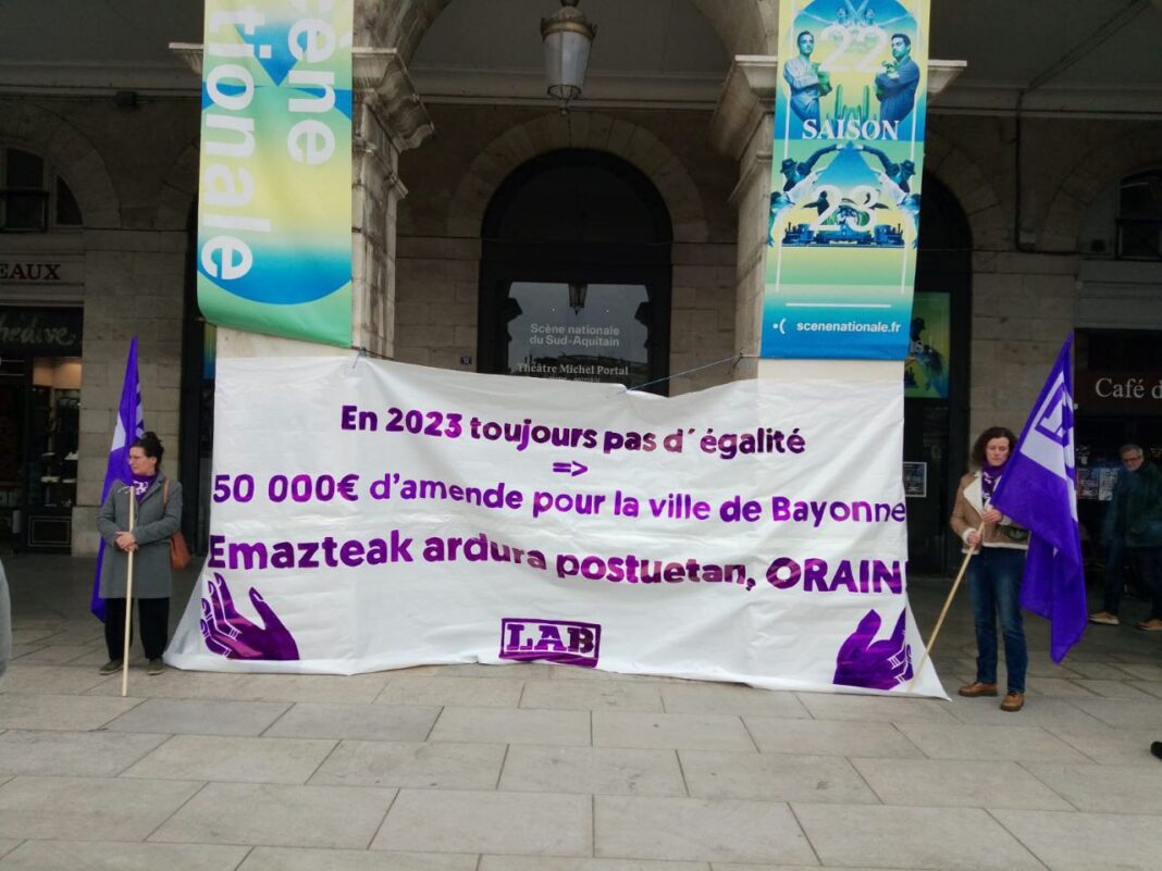 Estatuak Baionako Herriko Etxeari 50.000 euroko isuna jarri zion 2022ko abenduan, bere zerbitzuetako zuzendaritza-postuetan emazterik ez egoteagatik. Erakunde publiko honek, emazteak erantzukizuneko postuetan integratzeko egiazko giza baliabideen politika egin beharrean, nahiago du isuna ordaindu. Egoera onartezin hori salatzeaz gain, desberdintasunekin eta soldata arrakalarekin behin betiko amaitzeko neurri eraginkorrak aldarrikatu ditu LABek.