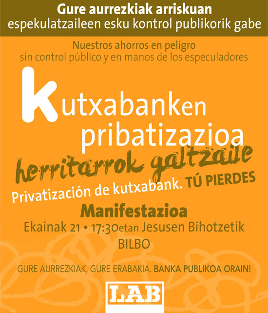 InicioBidalketak2014Bihar, ekainak 21, KUTXABANKen pribatizazioaren aurkako manifestazioa Bilbon 2014 Bihar, ekainak 21, KUTXABANKen pribatizazioaren aurkako manifestazioa Bilbon Cuota WhatsAppFacebookTwitterEmailImpresiónTelegram 2014-06-20 0 «KUTXABANKen pribatizazioaren aurkako manifestazioa ekainaren 21ean Bilbon» «Esta batalla la vamos a ganar. En Euskal Herria, Banca Pública» Bea Martxueta y Txomin Lorca «Euskal Kutxen likidazioa bizkortzen ari da. Hilak 30 baino lehen gauzatu nahi dute» Cuota WhatsAppFacebookTwitterEmailImpresiónTelegram Artículo anteriorPribatizazioaren kontrako bozka emateak zigorra ekarriko duela jasotzen duen puntua gai ordenetik erretira dezala eskatu diote LAB eta ELAk BBKriArtículo siguienteMilaka euskal herritar Bilboko kaleetara irten dira KUTXABANKen pribatizazioari ezetz esatera AZKEN ALBISTEAK | ÚLTIMAS NOTICIAS LAB ha participado en el congreso de la central sindical chipriota PEO 2025-12-05 El coordinador general de LAB, Igor Arroyo, se ha sumado a la reivindicación de unidad y autodeterminación de Chipre en en el congreso de... La pretensión de llevar la Ley de Empleo Público al Tribunal Constitucional español supone un agravamiento de la ofensiva judicial contra el euskera 2025-12-05 En contra de la opinión de la sociedad vasca y de la mayoría de los empleados públicos, la resolución podría prohibir situar el euskera... LAB denuncia de forma rotunda que hayan dejado a 111 personas en la calle en el barrio de Martutene de Donostia 2025-12-04 LAB recuerda que toda la ciudadanía tiene derecho a tener una vida que merezca ser vivida, y ha reclamado a las instituciones que lo...