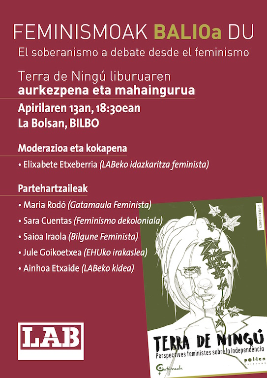 "Terra de Ningú" liburua Kataluniako prozesu eratzaileari begirako ekarpena da. Mundu mailako emakume ezberdinen ekarpenekin egindako liburua da. Liburuaren aurkezpena egingo dute ostiralean, eta Euskal Herrira begirako eztabaida mahai gaineratzeko baliatuko dute eguna.