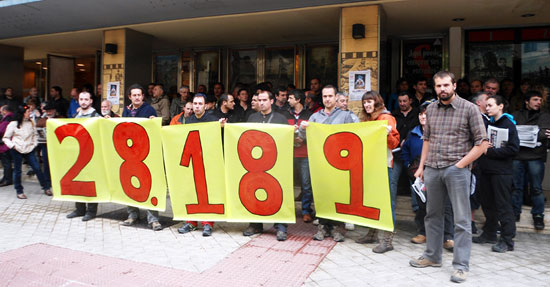 La Mesa por el Empleo ha fracasado porque UPN y PSN han decidido mantener la nefasta política de empleo que hemos conocido en Navarra, basada en Planes de empleo sin eficacia. LAB quiere resaltar que sí hay alternativas para crear empleo y así lo expresó en la Mesa por el Empleo. En concreto, con cinco medidas se podrían crear 28.189 puestos de trabajo y en Navarra existe la riqueza suficiente para financiarlos (ver cuadro inferior). Hoy, delegados y delegadas del sindicato LAB han posado tras la esa cifra de "28.189" para defender las medidas que realmente pueden crear empleo en Navarra, tras una Asamblea celebrada en los Cines Carlos III.