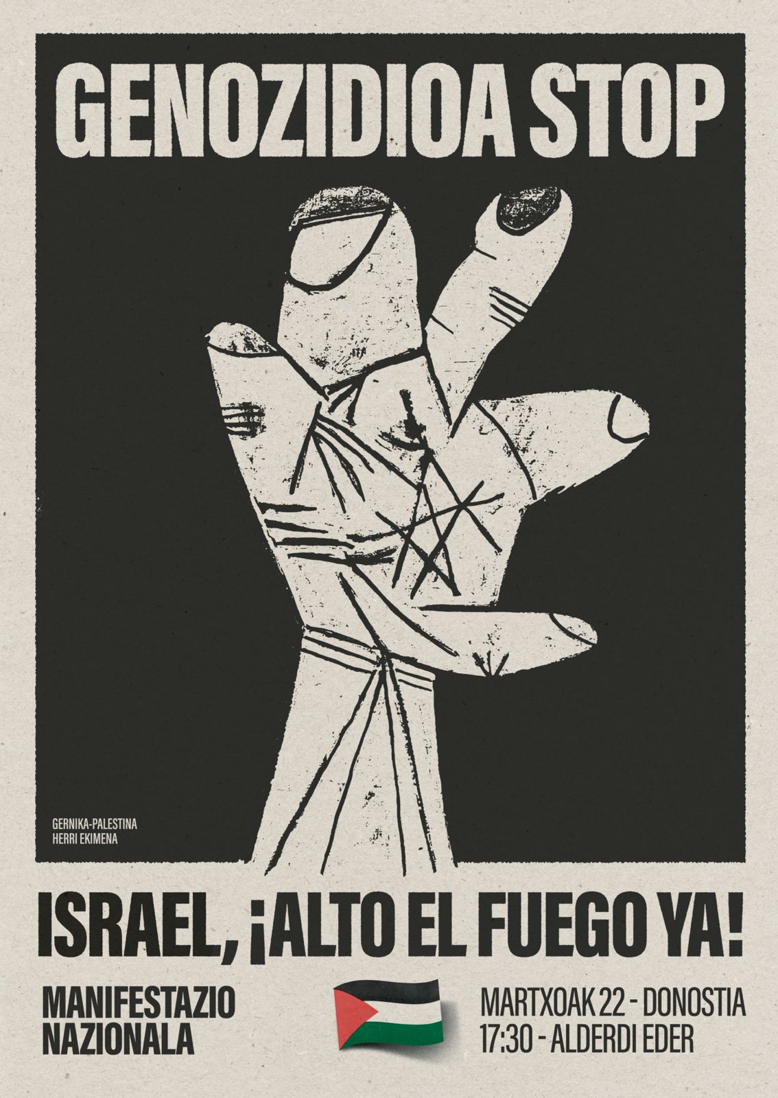 Nos corresponde a todos y todas, cada uno y una desde su lugar, exigir e impulsar el fin del genocidio. En este sentido, hacemos un llamamiento a las instituciones vascas y a la patronal para que se posicionen ante el genocidio que sufre el pueblo palestino y el sionismo que lo está impulsando. Les pedimos que rompan relaciones con los genocidas, con los que están vulnerando permanentemente los derechos humanos.