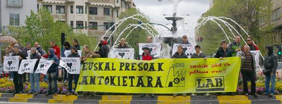 Hoy viernes 13 de abril el sindicato LAB ha realizado una concentracion frente a la Delegación del Gobierno en Nafarroa en favor de los derechos civiles y politicos de los presos y presas vascas. En contra de la dispersión, del mantener en prisión a presos y presas con enfermedades graves, de las condenas de por vida, del mantenimiento en la carcel de las y los reclusos que han cumplido tres cuartas partes de su condena, del aislamiento y de la criminalización.
