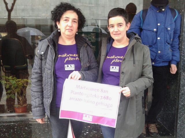 LAB ha realizado hoy una concentración ante el Consejo de Relaciones Laborales, en Bilbo, con el lema “Nuestro trabajo cuenta, 7.680 euros menos. Emakumeok planto!”. Esta movilización se ha llevado a cabo con motivo de la reunión convocada por el Departamento de Justicia y Trabajo del Gobierno Vasco para hablar de la brecha salarial entre mujeres y hombres. A esa reunión han acudido dos miembros de LAB, Arantxa Vazquez entre ellas, en representación del Comité Ejecutivo. En el encuenro, el sindicato ha realizado una lectura sobre la proposición no de ley del Parlamento de Gasteiz sobre el tema y ha propuesto medidas para hacer frente a la brecha salarial. Confebask y el PNV, en cambio, no han hecho ninguna propuesta. Es más, la patronal ha señalado que el problema de la brecha salarial no es su responsabilidad y que no observa discriminación, mientras que el PNV ha indicado que no está dispuesto a interpelar a la patronal.