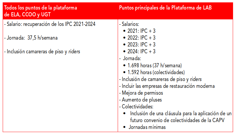 ELA, CCOO y UGT presentaron una plataforma conjunta en la cual únicamente hacían constar tres puntos: Salario (IPC), inclusión de camareras de piso y riders y una jornada anual de 37,5 horas semanales. Después de esta propuesta por parte de estos tres sindicatos, que deja a un lado muchas reivindicaciones y ámbitos, la patronal presentó una propuesta el 14 de noviembre que no garantizaba el poder adquisitivo, planteó una reducción de jornada solo de dos horas y que el complemento de las incapacidadtes temporales sea a partir del día 30 de la baja.