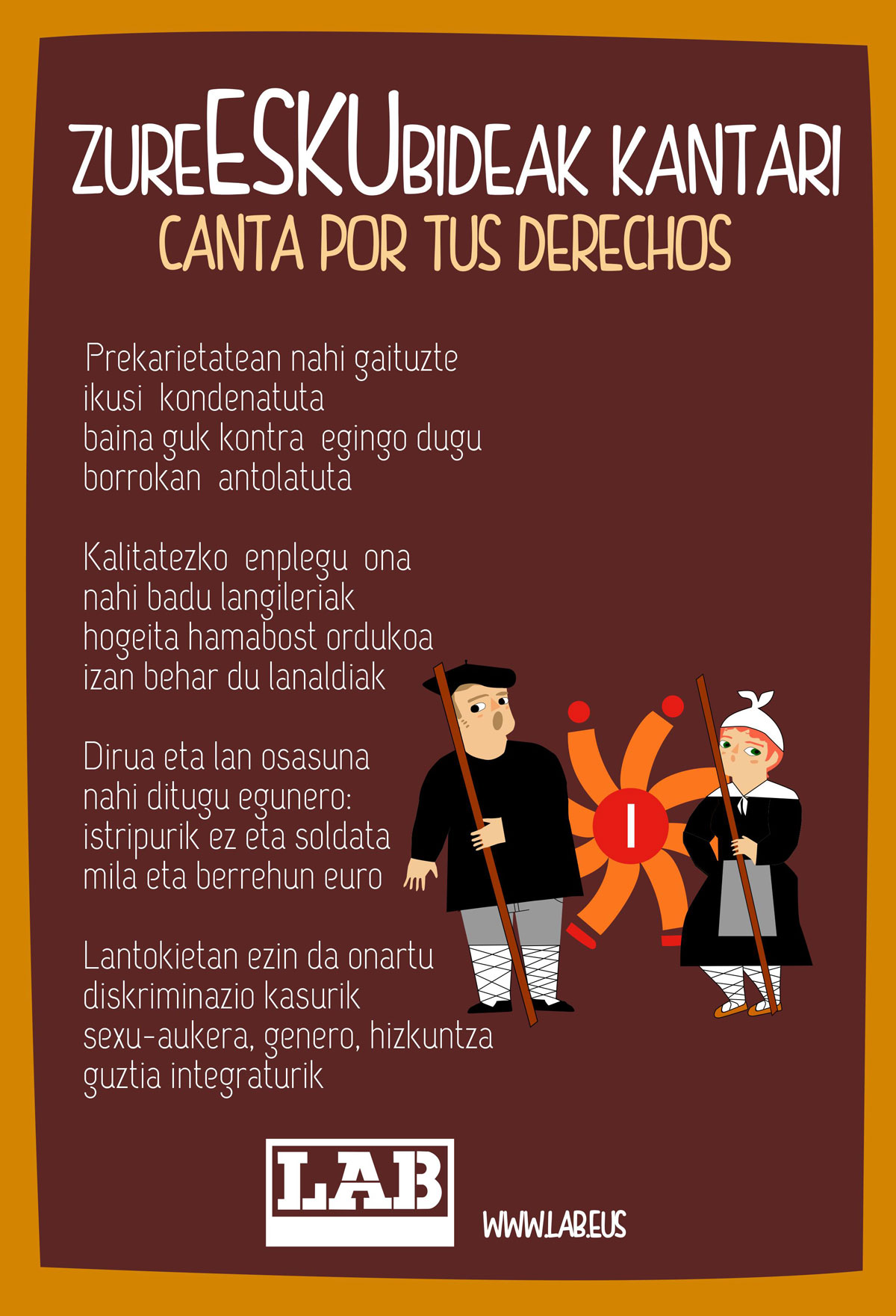 Hoy es víspera de Santa Agueda, un día para salir a cantar en Euskal Herria desde hace muchos años. Las mujeres y hombres de LAB hemos querido hacer nuestra pequeña aportación a esta jornada y nos gustaría lanzar un claro mensaje a los y las trabajadoras de este país, ¡actívate por tus derechos! Haz frente a la precariedad. Para ello hemos puesto en marcha la iniciativa “Zure ESKUbideak, ¡actívate por tus derechos!”