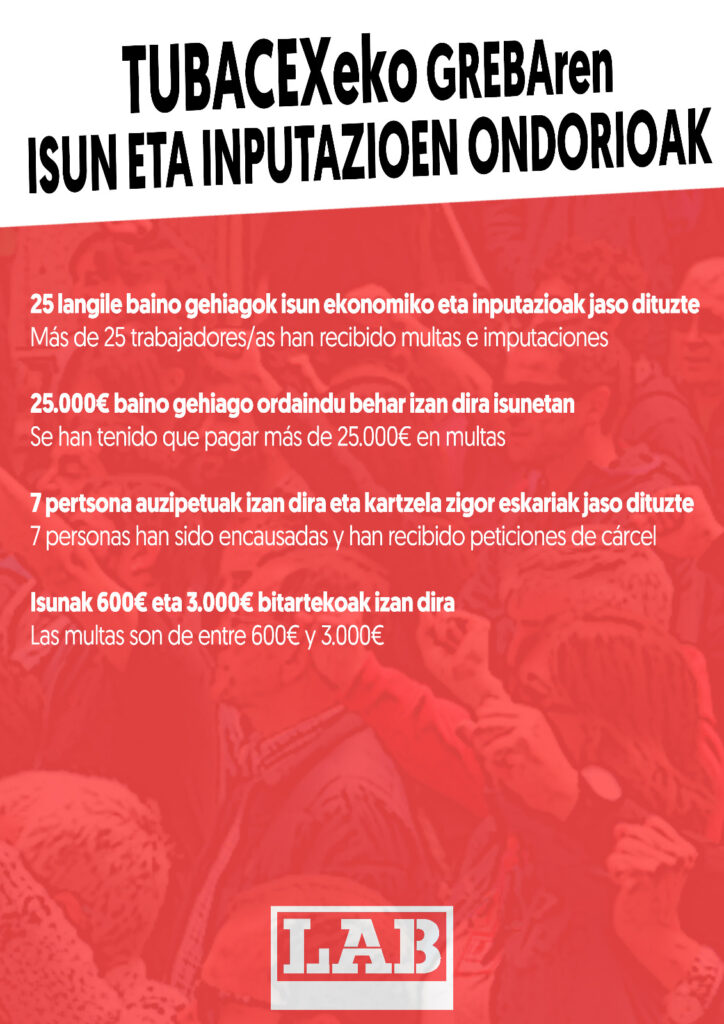 Esto se suma a las innumerables multas, amenazas y diversas imputaciones desproporcionadas que han tenido que sufrir los y las trabajadores de Tubacex tanto durante la huelga como después de la misma. Aunque aunque se materializan de forma individual, cada una de las sanciones e imputaciones son un ataque directo hacia la lucha colectiva de todos y todas.