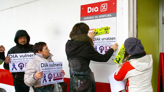 Azaroaren 25eko testuinguruan, LAB sindikatuak sistema kapitalista patriarkal honek emakumeon aurka erabiltzen dituen indarkeria mota ezberdinak azalarazi eta salatu zituen atzo DIA supermerkatu baten aurrean. Kasu honetan enpresak ez du bortizkeria sexista jasan duten emakumeak babesten dituzten legeak betetzen.