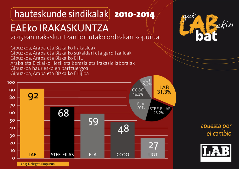 Atzoko EAEko irakaskuntzako Hauteskunde Sindikalek LABen nagusitasuna berretsi zuten. Datuak esku artean, LABek esparru publikoan zuen gehiengoari eusten dio. Honek orain arte eginiko lanarekiko babesa adierazten du, bai eta aurrerantzean egin beharreko lanaren ardatza: langileon eta Euskal Herriaren eskubideen alde borrokan jarraitzea.