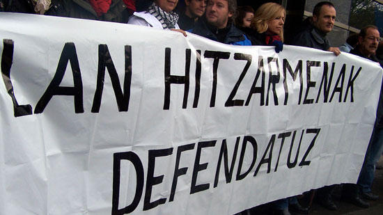 «Lan hitzarmenak defendatuz» lelopean bi elkarretaratzen egin dituzte gaur EITBko berrogeitik gora lagunek Gasteizen, lehena EITBren egoitzaren aurrean egin dute, eta bigarrena Lehendakaritzaren egoitzan.