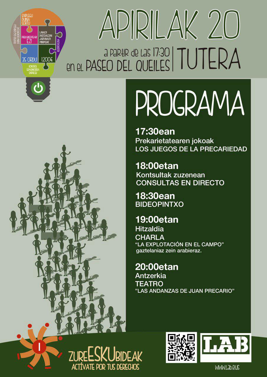 Empezaremos la jornada a las 17:30 con Los juegos de la precariedad. Después, las Consultas en directo servirán de ocasión para compartir experiencias y dudas laborales. A las 18:30, junto a las proyecciones de vídeos y una exposición, habrá degustación de pintxos. Más tarde, delegados del sector tratarán La explotación en el campo en sendas charlas en castellano y árabe. Y finalizaremos con la obra de teatro Las andanzas de Juan Precario.