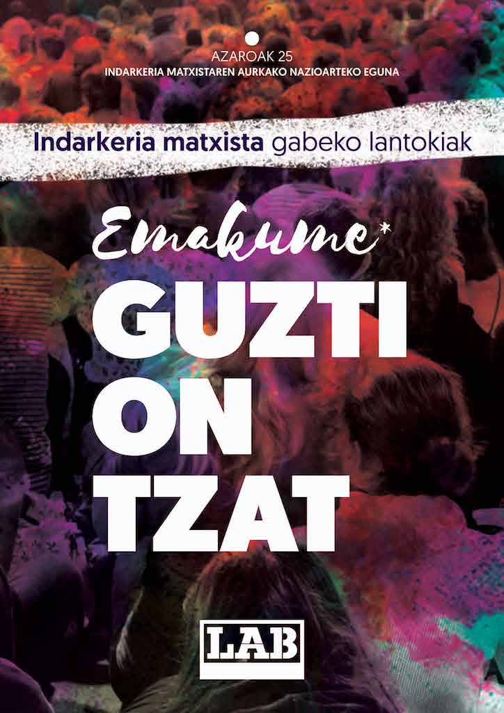 Junto con ello, también vemos necesario poner sobre la mesa las alternativas, herramientas y recursos de los que disponemos para luchar contra ello. Para trabajar todo ello, LAB llevará a cabo en Iruñea una jornada interna para su militancia. En la misma participarán Ana Pinto y Najat Bassit (integrantes de Jornaleras de Huelva en Lucha), la trabajadora de Lantegi Batuak Miren Beltrán; la señóloga, técnica de igualdad y activista trans Aitzole Araneta y la Secretaria Feminista de LAB Elixatebe Etxeberria.