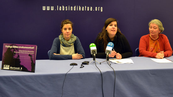 La secretaria de la Mujer de LAB ha presentado hoy en Bilbo las movilizaciones que llevará a cabo con motivo del 8 de Marzo, Día de la Mujer Trabajadora. Tras hacer balance de la grave situación que atraviesa la mujer en el mundo laboral, el sindicato ha reclamado la necesidad de un marco propio de relaciones laborales para Euskal Herria. Única vía para el sindicato para asegurar el derecho a un empleo digno y de calidad para las mujeres..