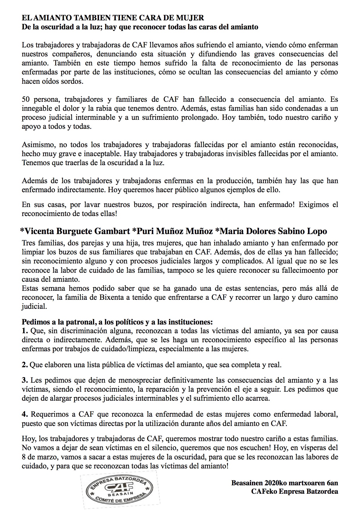Tres familias, dos parejas y una hija, tres mujeres, que han inhalado amianto y han enfermado por limpiar los buzos de sus familiares que trabajaban en CAF. Además, dos de ellas ya han fallecido; sin reconocimiento alguno y con procesos judiciales largos y complicados. Al igual que no se les reconoce la labor de cuidado de las familias, tampoco se les quiere reconocer su fallecimiento por causa del amianto. Así, al hilo del 8 de Marzo, Día Internacional de la Mujer, el Comité de Empresa de CAF Beasain ha realizado una rueda de prensa bajo el lema “De la oscuridad a la luz; hay que reconocer todas las caras del amianto”. Según han denunciado en la comparecencia que ha tenido lugar en Beasain, "en sus casas, por lavar nuestros buzos, por respiración indirecta, han enfermado. Exigimos el reconocimiento de todas ellas".