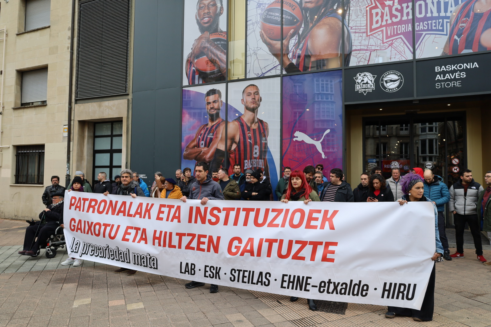 Los sindicatos LAB, ESK, STEILAS, EHNE-etxalde e HIRU nos hemos concentrado hoy en Gasteiz frente a la tienda del Baskonia-Alavés para denunciar la primera muerte laboral del año. El 7 de enero falleció el trabajador I.R.T., de 54 años, que trabajaba en unas obras del Baskonia-Alavés, al ser atrapado por una máquina de movimiento de tierras. Subcontratado por Construcciones Urrutia, trabajaba para la empresa Excavaciones Mendiola.
