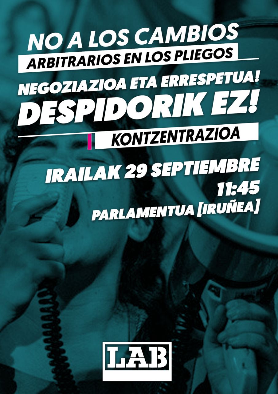 Esto que parece imposible de conseguir, es posible, si las plantillas del sector nos organizamos. Como próximo movimiento, el miércoles 29 de septiembre a las 12,15 horas, iremos al Parlamento de Navarra a la sesión de trabajo de la Comisión de Derechos Sociales, a exponer la situación y presentar nuestras propuestas. Media hora antes, a las 11,45 horas, nos concentraremos frente al hemiciclo para que se nos escuche alto y claro.