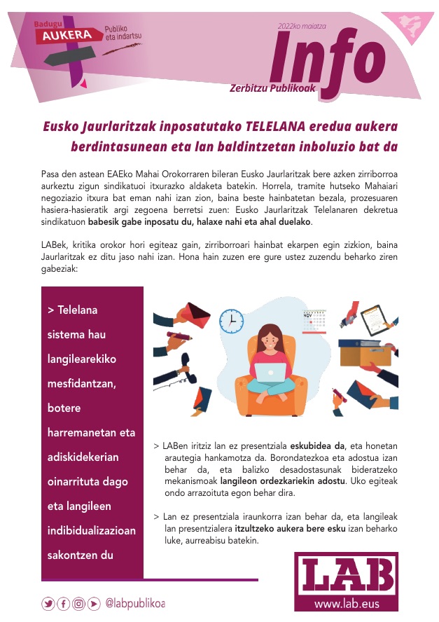 LAB, además de hacer esta crítica general, hizo varias aportaciones al borrador que el gobierno no ha querido recoger. Este sistema de teletrabajo está basado en la desconfianza hacia el trabajador o trabajadora, las relaciones de poder y el amiguismo y profundiza en la individualización de las y los trabajadores.