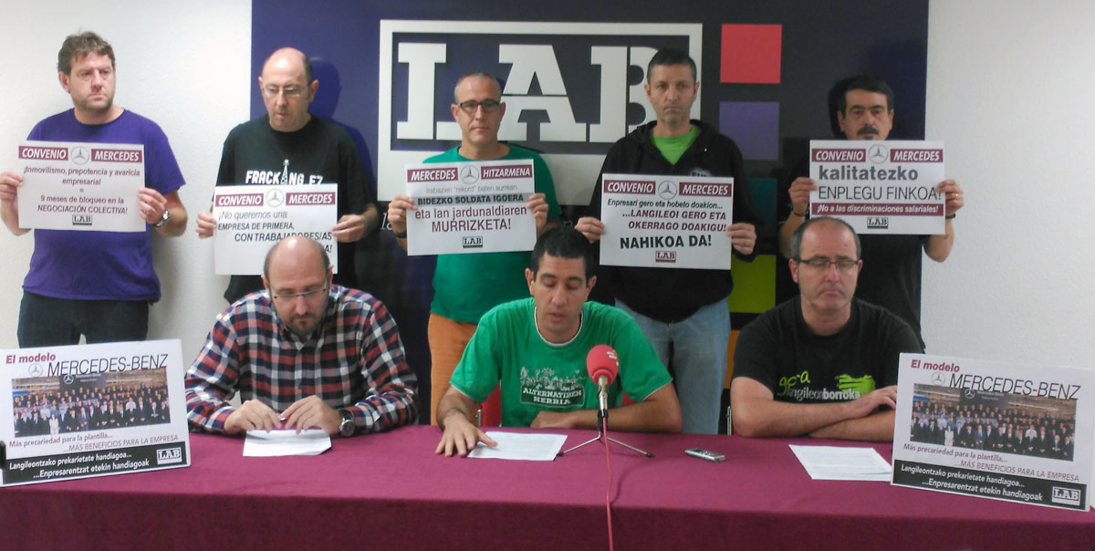 Hoy LAB ha ofrecido una rueda de prensa para exponer las conclusiones del análisis realizado por el sindicato sobre la situación económica de la empresa MERCEDES BENZ. Asimismo hemos querido trasladar la situación actual en que se encuentra la negociación del convenio y ofrecer la lectura que hace el sindicato sobre todos estos asuntos. Mercedes nunca ha vivido una situación tan buena desde el punto de vista económico y productivo como la actual y, paradójicamente, nunca ha sufrido tanta precariedad la planta de Gasteiz.