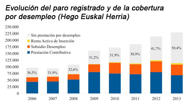 Así, comprobamos que en la actualidad más de la mitad de las personas en paro (el 50,4%) no reciben ningún tipo de prestación por desempleo, lo que significa que en Hego Euskal Herria 115.611 personas se encuentran en esta dura situación.