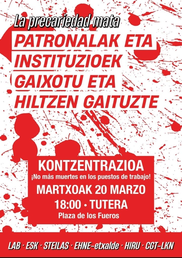 Por ello, los sindicatos LAB, ESK, STEILAS, EHNE Etxalde e HIRU, que formamos la Intersindical, queremos hacer un llamamiento a la movilización que realizaremos el próximo jueves, 20 de marzo, a las 18:00 en la plaza de los Fueros de Tutera.
