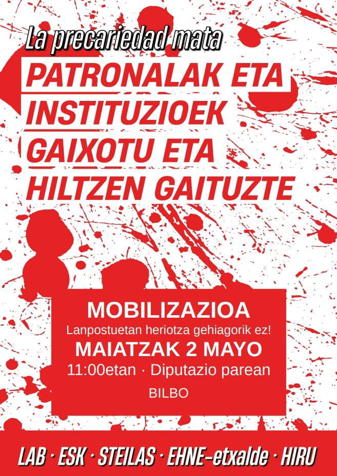 Por todo ello, el día 2 de Mayo, a las 11:00 horas, en Bilbao, llamamos a participar en la movilización impulsada desde la intersindical frente a la Diputación de Bizkaia.