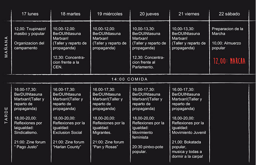 Esta semana, del 17 al 22 de octubre, se está realizando una Acampada por la Igualdad en el Paseo Sarasate. El objetivo es pedir el fin de toda discriminación en el mundo laboral, así como trabajo digno para todos y todas. Se trata de una reivindicación básica, que por desgracia sigue sin resolverse satisfactoriamente. El cambio institucional producido en Navarra ha terminado con la marginación institucional de una parte de la sociedad. Sin embargo, en los centros de trabajo, perviven actitudes discriminatorias. Se discrimina por razón de sexo, de raza, por tener discapacidad. Además, en determinadas empresas se ha discriminado también en base a la afiliación sindical.