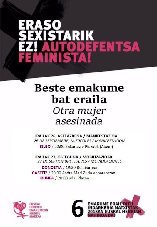-Irailak 26, asteazkena, manifestazioa Bilbon, 20:00etan, Atxuriko Enkartazio plazatik abiatuta.