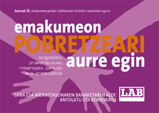 Azaroaren 25a, emakumeenganako indarkeriaren kontrako nazioarteko eguna gerturatzen ari den honetan LABek ezinbestekotzat jotzen du emakumeon pobretzeari aurre egitea. Jada ez du inork zalantzan jartzen euskal herritarron gehiengoa gero eta pobreagoa garela. Pobretze prozesu honen adierazle diren datu eta estatistikek, gehienetan, genero ezberdintasunak ezkutatzen dituzten arren, kaltetuenak emakumeak izaten ari gara.