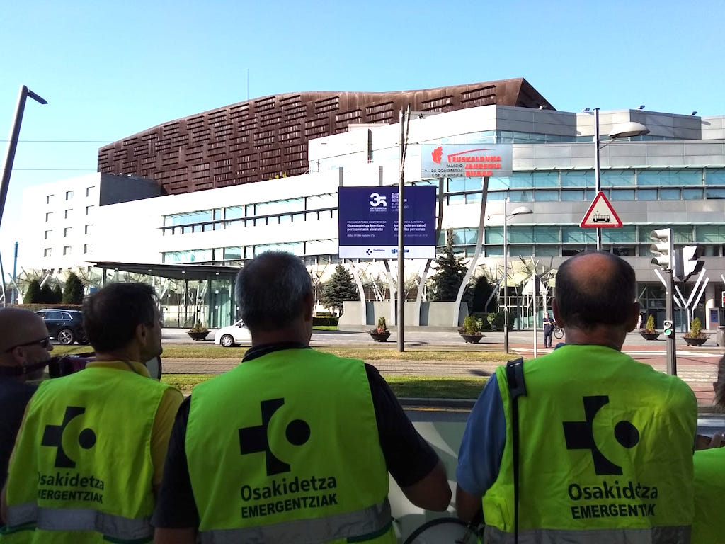 La plantilla de Emergencias de Osakidetza se ha concentrado hoy en el Palacio Euskalduna de Bilbao. La Junta de Personal de Emergencias de Osakidetza, junto a los sindicatos LAB, ELA, CCOO, SATSE, ESK, SME y UGT, ha decidido retomar las protestas ante la total inactividad de Osakidetza y la falta de propuestas claras en la Mesa Sectorial de Sanidad. En la última reunión del 3 de julio, Osakidetza se comprometió a revisar las propuestas de las y los trabajadores, pero todavía no han recibido ninguna respuesta.