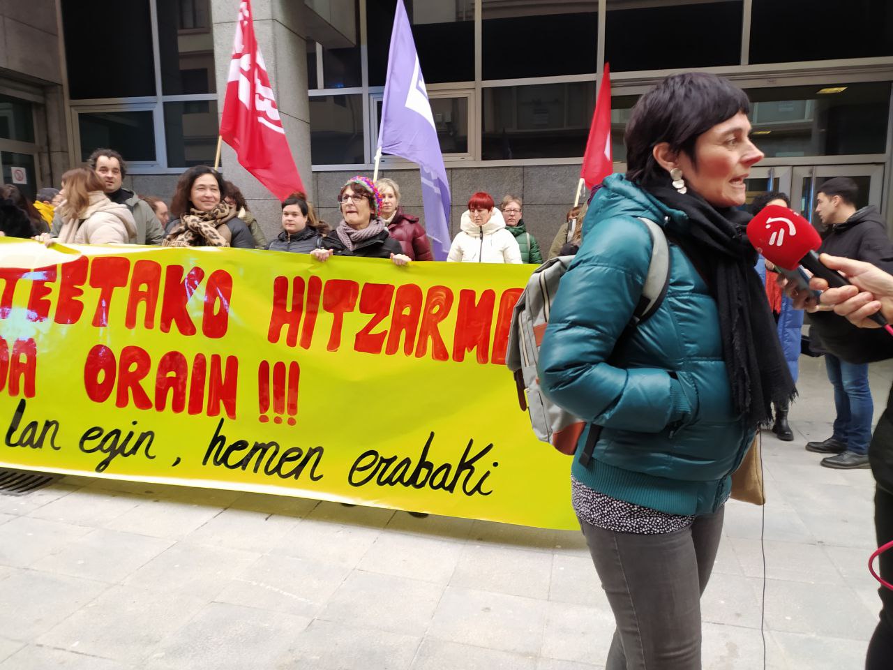 LAB dijo que utilizaría todas las vías para defender el derecho de las trabajadoras de colectividades a negociar aquí sus condiciones laborales y hoy, 31 de enero, así lo ha defendido en los tribunales. En cualquier caso, el sindicato tiene muy claro que este debate es más político que jurídico. Las últimas reformas laborales han supuesto una clara apuesta por la estatalización de la negociación colectiva. Esta medida premia a la patronal y distorsiona la representación sindical, y ahí está la clave de esta situación. Está en juego nuestro derecho a negociar, y cada día que a estas trabajadoras se les impide ejercer ese derecho, están retrociendo en sus condiciones de trabajo, el colectivo se está dividiendo y cada vez hay más trabajadoras en diferentes situaciones laborales, muchas de las cuales están sujetas a convenios estatales. “Al mismo tiempo se está acelerando el proceso de estatalización y precarización de las condiciones laborales de este sector”, afirma Garbiñe Aranburu, coordinadora general de LAB, que también ha tomado parte en la concentración. Ha añadido que la actitud de la patronal en este sentido es “denunciable”: “La única razón de no querer abrir un ámbito de negociación en la CAV, es la voluntad de apostar por la estatalización y uniformización a la baja de las condiciones laborales”.