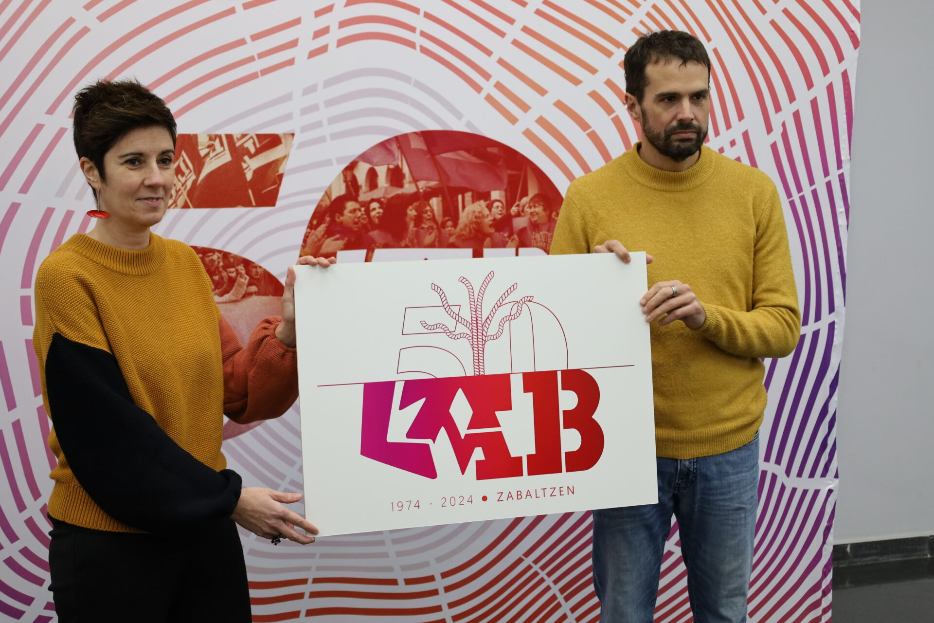 La secretaria de Organización, Izaskun García, y el coordinador general, Igor Arroyo, han ofrecido hoy una rueda de prensa en Bilbo para presentar los actos del 50 aniversario del sindicato. Cerca de los 50.000 afiliados y afiliadas y convertido en el segundo sindicato con mayor representación en Hego Euskal Herria, LAB ha expresado su voluntad de seguir extendiendo el sindicalismo transformador vasco.