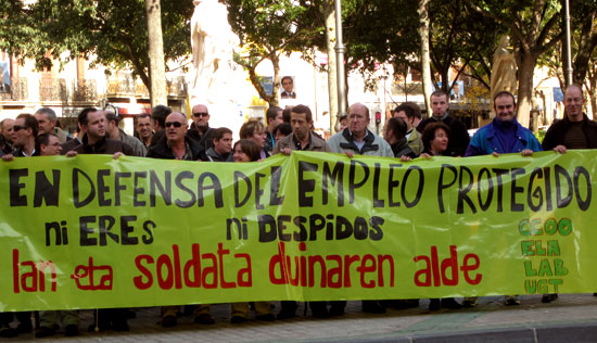 Atzo, azaroak 9, enplegu babestuaren defentsan CCOO, ELA, LAB eta UGT sindikatuek deituta enplegu zentro berezi, zentro okupazional eta lan munduan txertatzeko zentroetako ordezkarien asanblada burutu zen Iruñean. Ondorenean elkarratatzea egin zuten Parlamentuaren aurrean.