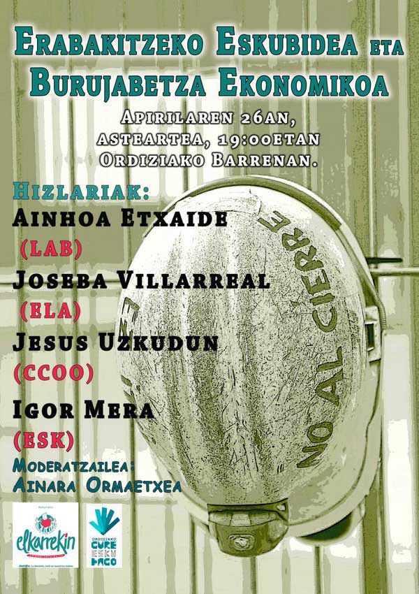 Bihar, hilak 26, arratsaldeko 19etan, erabakitzeko eskubidea eta burujabetza ekonomikoa izango dira aztergai ordizian, Elkarrekin eta Gure Esku Dagok antolatutako mahai inguruan. Ainhoa Etxaide, LABeko Idazkari Nagusia, Joseba Villarreal (ELA), Jesus Uzkudun (CCOO) eta Igor Mera (ESK) izango dira hizlariak.