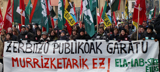 Lakuako Gobernuak administrazio publikoan iragarritako murrizketen aurka ELA, LAB eta STEE-EILAS sindikatuek deitutako lanuzteak eta mobilizazioak ari dira egiten gaur Funtzio Publikoan. Lehenengo datuen arabera jarraipen handia izan du sindikatuek 11:00etatik 15:00etara egindako lanuzterako deialdiak. 12:30etan manifestazioak egin dira Gasteiz, Bilbo eta Donostian "Zerbitzu publikoak garatu. Murrizketarik ez!" lelopean.