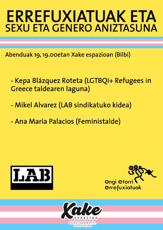 Bilboko Xake espazioan hitzaldi bat eskainiko du bihar, abenduak 19, Ongi Etorri Errefuxiatuak dinamikak, LABen babesarekin. "Errefuxiatuak eta sexu eta genero aniztasuna" leloa izango du, eta 19:00etan hasiko da Bilbo Zaharreko espazio horretan.