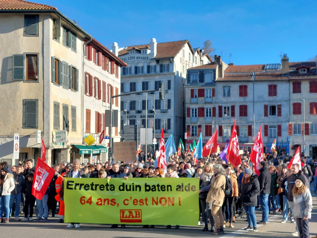 Intersindikalarekin batera goizean Baionan egin dugu mobilizazio nagusiak jendetza bildu du. LABek, gainera, manifestazioaren baitan ekintza bat gauzatu du Société Générale banketxearen egoitza batean, sistema publiko duina aldarrikatzeko afitxak itsatsi dituelarik.