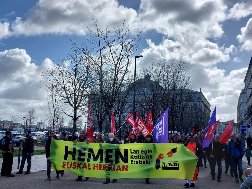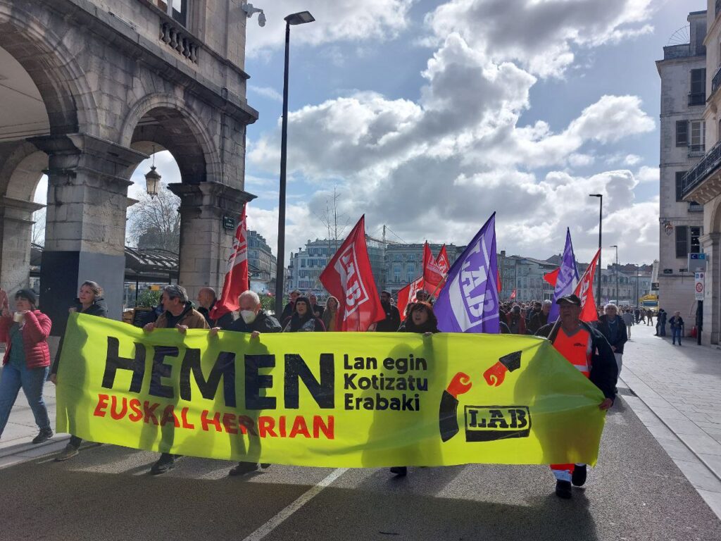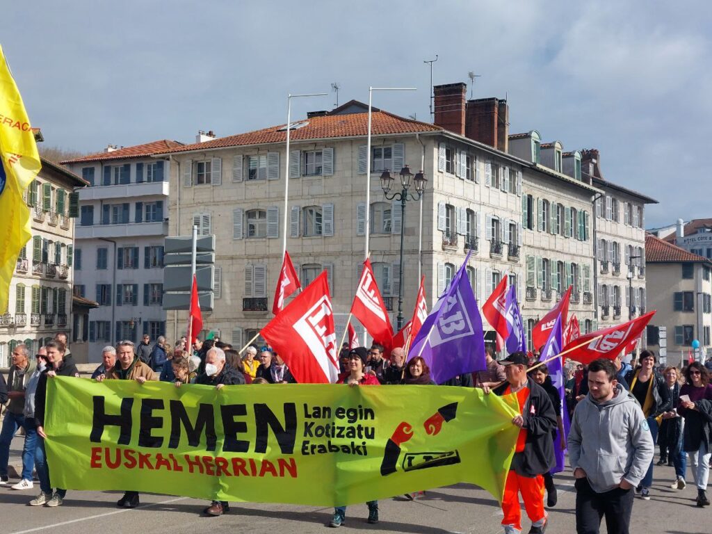 Blokeatze ekintzaz gain, 10:30ean manifestazioa abiatu da Baionako geltokitik. Jendetza bildu da gaur ere Lapurdiko hiriburuko karriketan. Parisek erretiro adina atzeratuko duen erreformaren asmoei eutsi bitartean, mobilizazioei eusteko asmoa agertu du LAB sindikatuak. Ildo horretan, datozen egunetarako ekintzak prestatzen jarraitzen dugu buru-belarri.