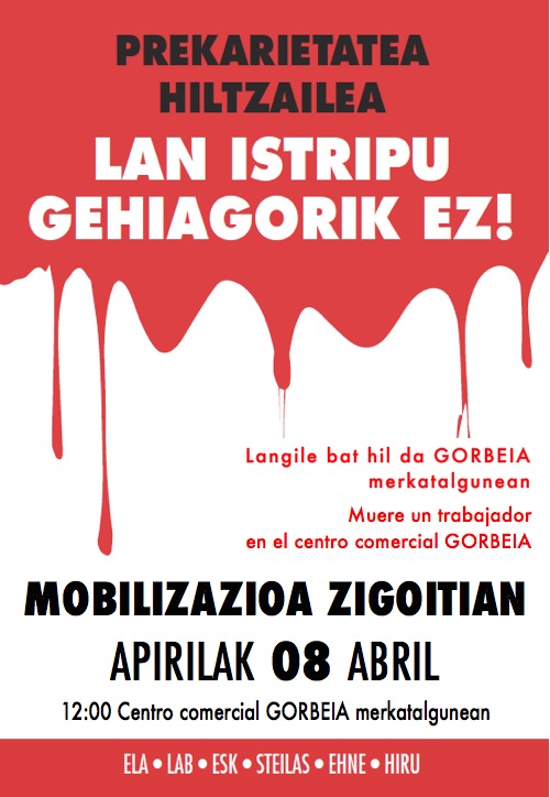 Desde el sindicato LAB vamos a seguir trabajando y luchando a favor de la seguridad y mejor salud laboral de los y las trabajadores. Por ello, llamamos a la clase trabajadora a participar en la concentración convocada por la mayoría sindical vasca, el próximo lunes 8 de abril, a las 12 del mediodía en el centro comercial gorbeia de Zigoitia.