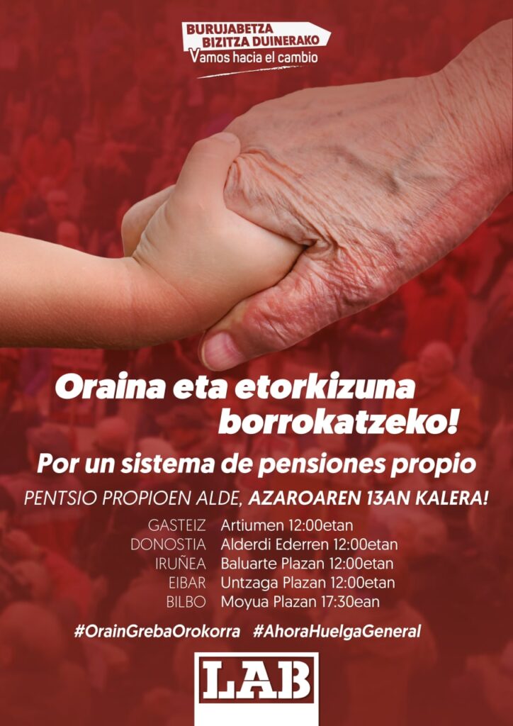 El movimiento de pensionistas ha comparecido para hacer un llamamiento a las manifestaciones que llevará a cabo el sábado 13 de noviembre. En este sentido, desde el sindicato LAB nos hemos sumado a la convocatoria y pedimos a las y los trabajadores que salgan a la calle porque está en juego el futuro de todas y todos.