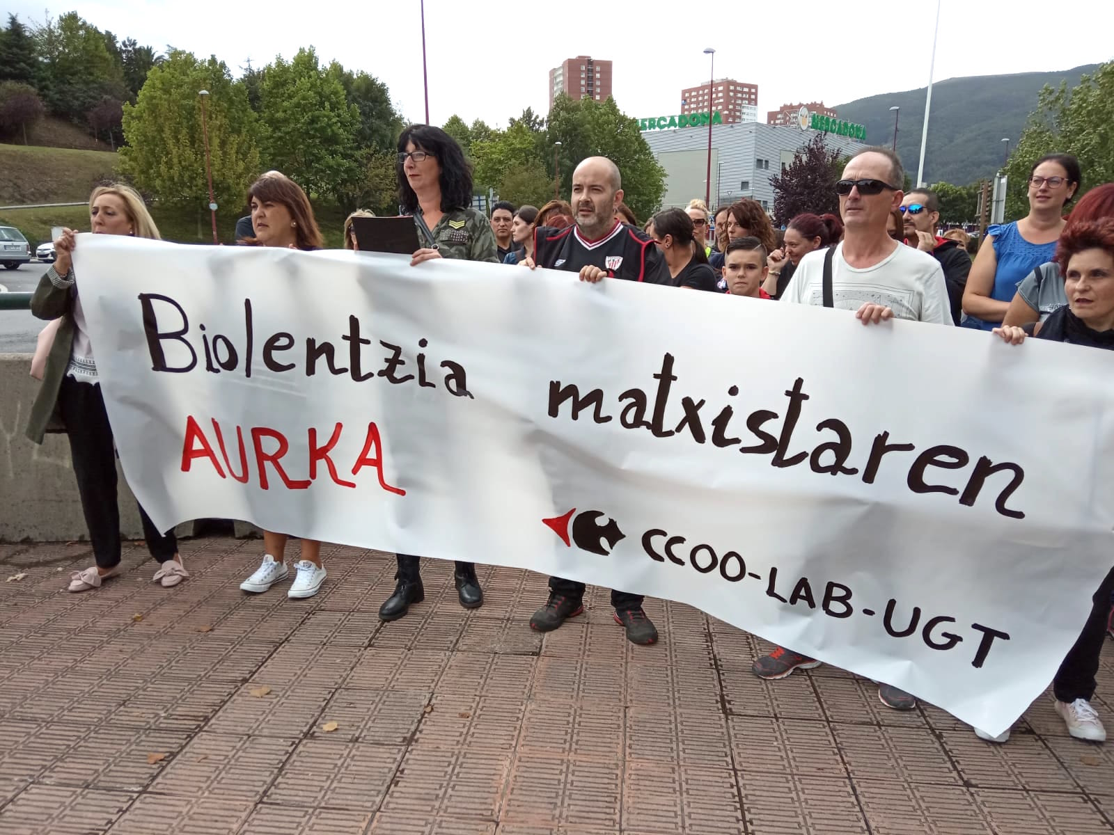 El comité de empresa de Carrefour de Sestao se ha movilizado para denunciar la agresión sexista que sufrió una compañera el pasado 24 de agosto. En la concentración, las y los trabajadores han mostrado su solidaridad a la compañera que sufrió la agresión.