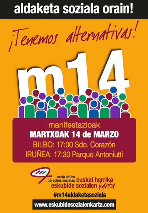 Euskal Herriko Eskubide Sozialen Kartak aldaketa sozialaren alde dagoen orori larunbat honetan, hilak 14, Bilbon eta Iruñean izango diren manifestazioetan parte hartzeko deia luzatu nahi dizuegu. Kartatik 16 puntuko Programa Soziala eratu berri dugu Euskal Herrian bizi eta lan egiten dugun pertsona guztiek aukera berdintasunasunean oinarritutako bizi baldintza duinak izan ditzagun. Gaurdanik eremu instituzionaletik abian jarri beharreko neurriak dira denak, eta hori aldarrikatuko dugu martxoaren 14an. Euskal Herria da euskal herritarron eskubideak bermatzeko subjetu burujabea eta alternatiba hor kokatzen da.