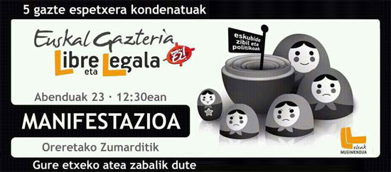 Datorren larunbatean, abenduak 23, Eskubide Zibil eta Politikoen herri mugimenduak (ELEAK) manifestazioa deitu du Espainiako Auzitegi Nazionalak Maitane Linazasoro, Xabier Lujanbio, Aitor Alberdi, Aitor Franco eta Arkaitz Antza gaztei ezarritako sei urte eta sei urte eta sei hilabete arteko kartzela zigorra salatzeko. Manifestazioa Oreretako Zumarditik aterako da "Gure etxeko atea zabalik dute" lemapean.