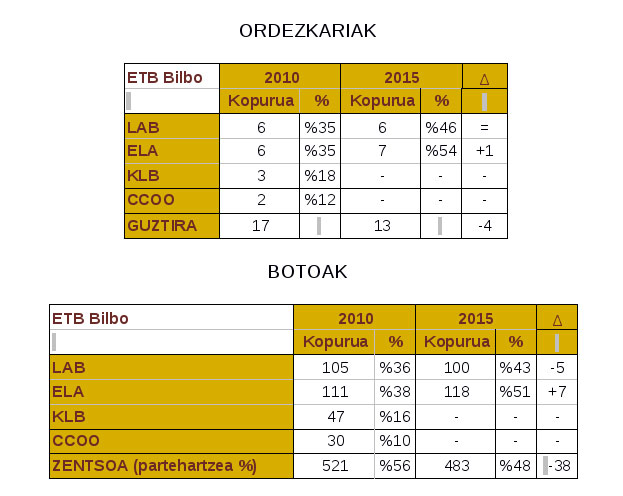 LABek ordezkari bat gehiago lortzen du (5), eta ELAk bat jaitsi (4), portzentualki botoen %5 igoz eta %26a jaitsiz. Eusko Irratiko hauteskunde sindikaletan plantillaren erregularizazioan LABek eta ELAk egindako apustuak markatuko zituela argi genuen guztiok. Kontutan eduki beharra dago Lanpostuen Deialdi Publikoaren prozesua amaitu gabe dagoela oraindik. Argi gelditu da langileek LABen jokabide zintzo eta koherentea babesten jarraitu dutela, eta ELAren bestelako jokabidea dela zigortu dutena.