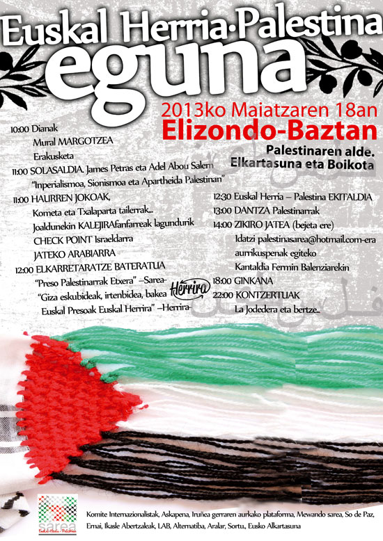 InicioSecretaría InternacionalPalestinaEuskal Herria - Palestina Eguna Elizondon maiatzaren 18an Palestina Euskal Herria – Palestina Eguna Elizondon maiatzaren 18an Cuota WhatsAppFacebookTwitterEmailImpresiónTelegram 2013-05-09 0 LAB SAREAN {module[111]} Cuota WhatsAppFacebookTwitterEmailImpresiónTelegram Artículo anteriorDeialdiakArtículo siguienteGipuzkoako Helduen Egoitzetako Hitzarmenaren alde mobilizazio berriak iragarri ditu LABek TagsPalestina AZKEN ALBISTEAK | ÚLTIMAS NOTICIAS Convocado por LAB, el profesorado ha llevado a cabo movilizaciones en centros públicos de Araba, Bizkaia y Gipuzkoa 2025-12-18 Cientos de docentes de decenas de centros han denunciado que no se están cumpliendo varios puntos recogidos en el acuerdo firmado el 9 de... LAB también llama a llenar Miribilla el 27 de diciembre para dar un nuevo impulso al euskera 2025-12-18 La emergencia lingüística del euskera es cada vez más evidente. Cada vez hay más estudios que demuestran que el euskera no tiene el futuro... LAB exige a Arcelor AMDS y al comité de empresa que aclaren el futuro de la plantilla de Legasa 2025-12-18 El sindicato LAB denuncia la falta de información sobre el futuro de la plantilla del centro de trabajo de Legasa tras el inicio del...