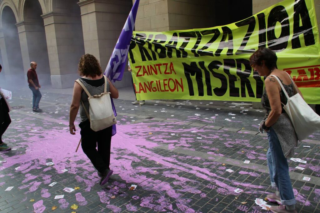 Hoy el sindicato LAB se ha movilizado ante la Diputación Foral de Gipuzkoa (DFG) para reivindicar de nuevo el carácter público de las trabajadoras de los cuidados y servicios sociales privatizados. El sindicato LAB, que se sumó a la Huelga Feminista General organizada por el Movimiento Feminista de Euskal Herria en favor del sistema público comunitario de cuidados, se ha reafirmado hoy en su compromiso con esta lucha. Han realizado una acción espectacular, llenando la Plaza de Gipuzkoa de pasos con pintura morada para ilustrar el camino recorrido, y sobre todo el que queda por recorrer a favor del sistema público comunitario de cuidados. También consideran imprescindible la colaboración entre los diferentes agentes sindicales, sociales y políticos.
