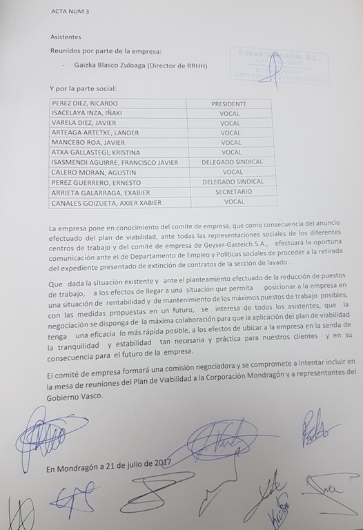 Esta es la nota del comité de empresa de Edesa Industrial-Geyser Gastech: