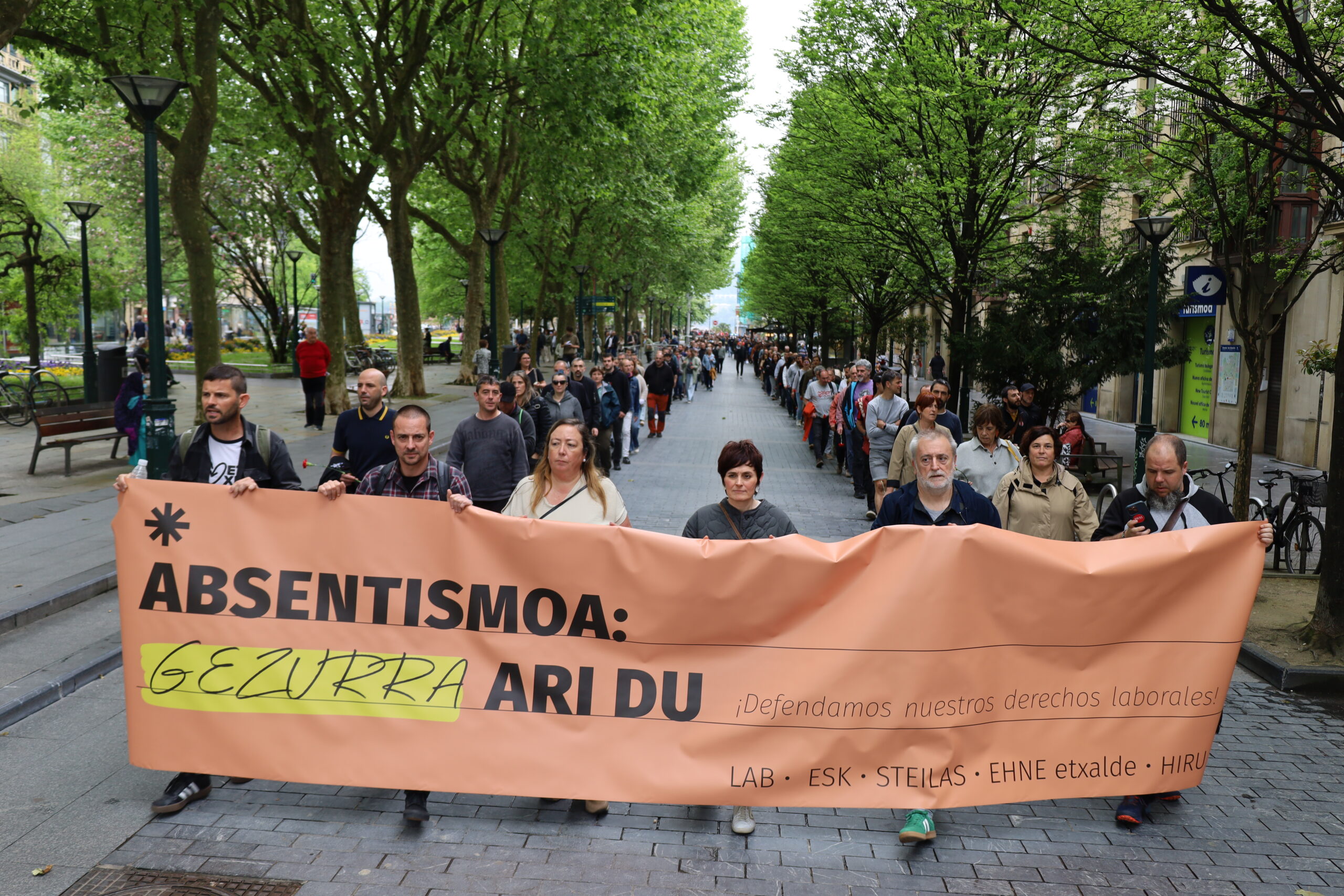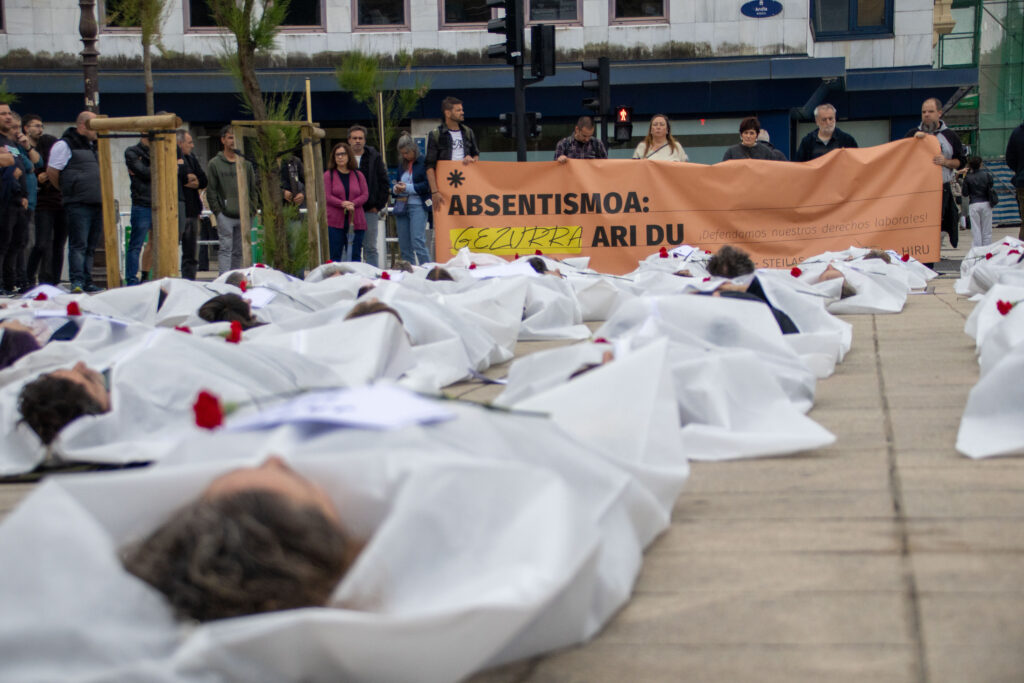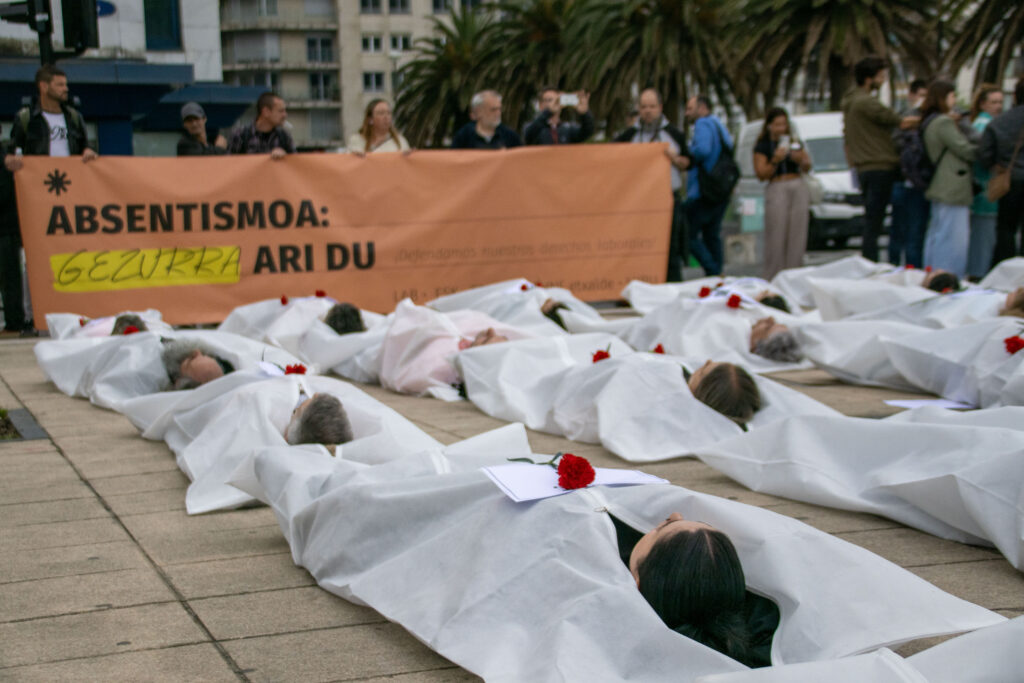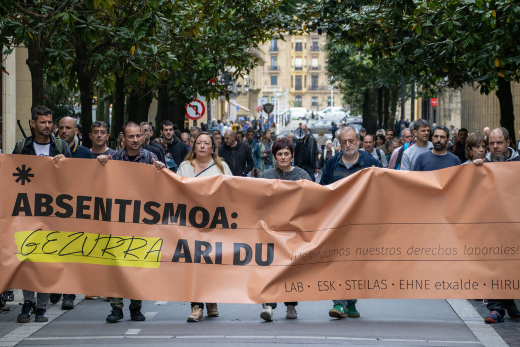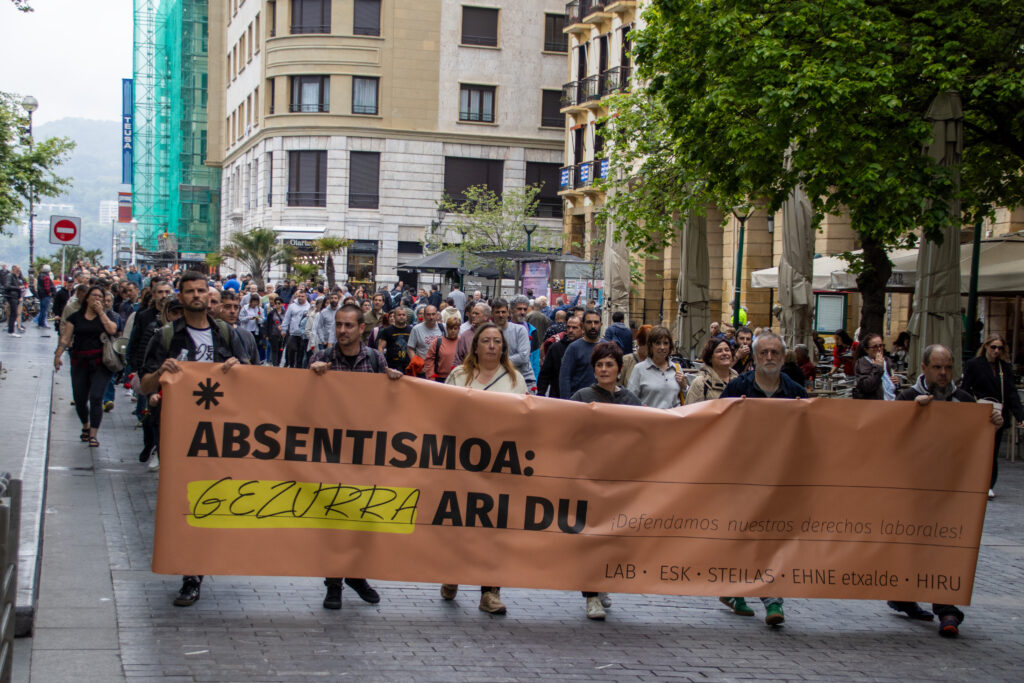 El 28 de abril es el Día Internacional de la Seguridad y la Salud en el Trabajo. Con este motivo, los sindicatos LAB, ESK, STEILAS, EHNE-etxalde e HIRU se han manifestado en Donostia, bajo el lema ‘La mentira del absentismo. ¡Defendamos nuestro derechos laborales’. La movilización ha concluido ante la sede del Gobierno Vasco, donde los sindicatos han representado los y las 84 trabajadoras muertas en Euskal Herria en 2025.