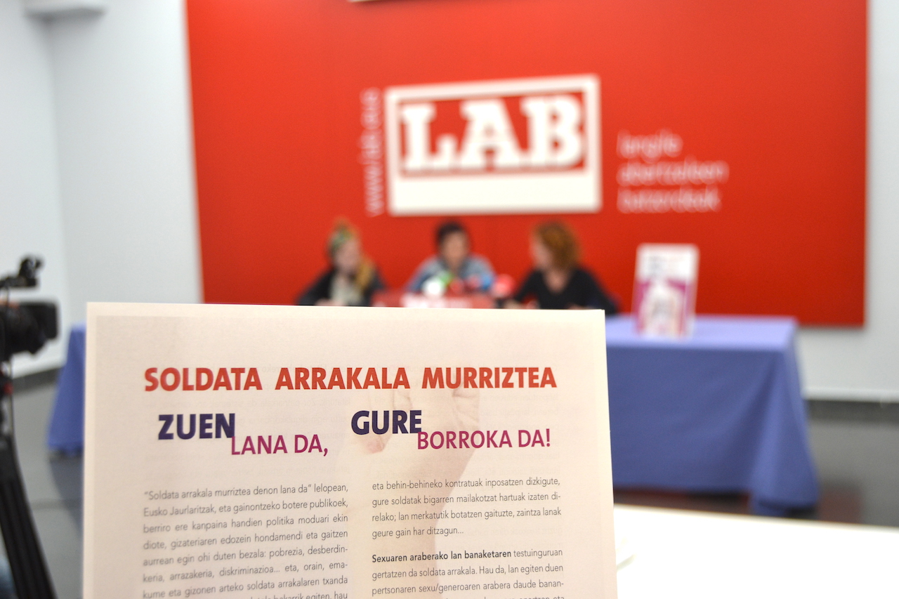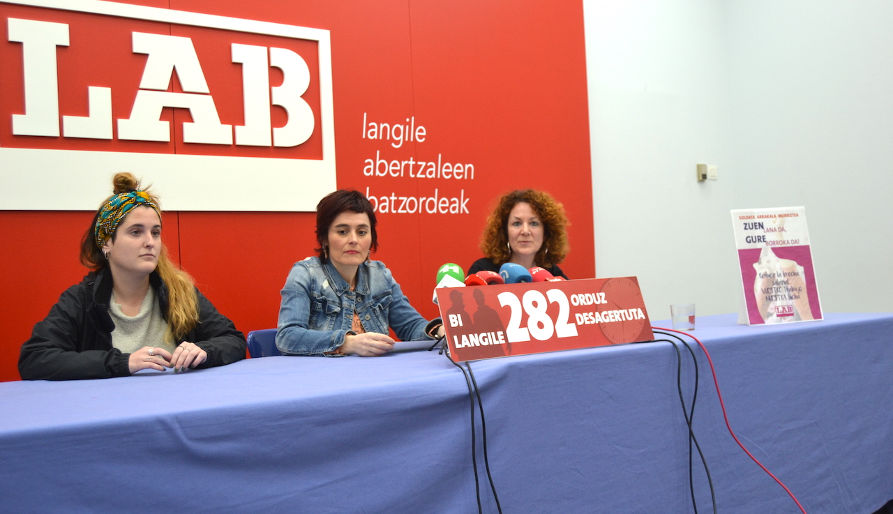 El 22 de febrero es el día por la igualdad salarial entre hombres y mujeres. En vísperas de esta fecha, Garbiñe Aranburu y Elixabete Etxeberria, secretaria general de LAB y secretaria de la Secretaría Feminista, respectivamente, han comparecido para presentar las medidas que proponemos para hacer frente a la brecha salarial y las iniciativas que vamos a realizar para ello. Concretamente, el viernes realizaremos un seminario en Gasteiz para abordar asuntos como la necesidad de reconocer, reorganizar y repartir de manera colectiva y de forma equitativa todos los trabajos, incluidos los de cuidados.