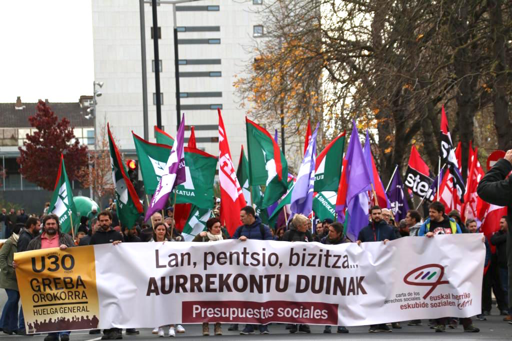 Los agentes que conformamos la Carta de Derechos Sociales de Euskal Herria hemos realizado un acto en Gasteiz, en Iradier Arena, para denunciar los presupuestos de la CAV para 2020, dentro de la dinámica movilizadora que tendrá como hito la Huelga General del 30 de enero. En palabras de Garbiñe Aranburu, secretaria general de LAB, "mientras desde la mayoría sindical y social realizamos propuestas en favor de un trabajo, unas pensiones y una vida dignas, el Gobierno Vasco está tomando decisiones en otra dirección. Este año, ha decidido nuevamente dar la espalda a las necesidades de las personas". Después del acto, nos hemos movilizado por las calles de Gasteiz.